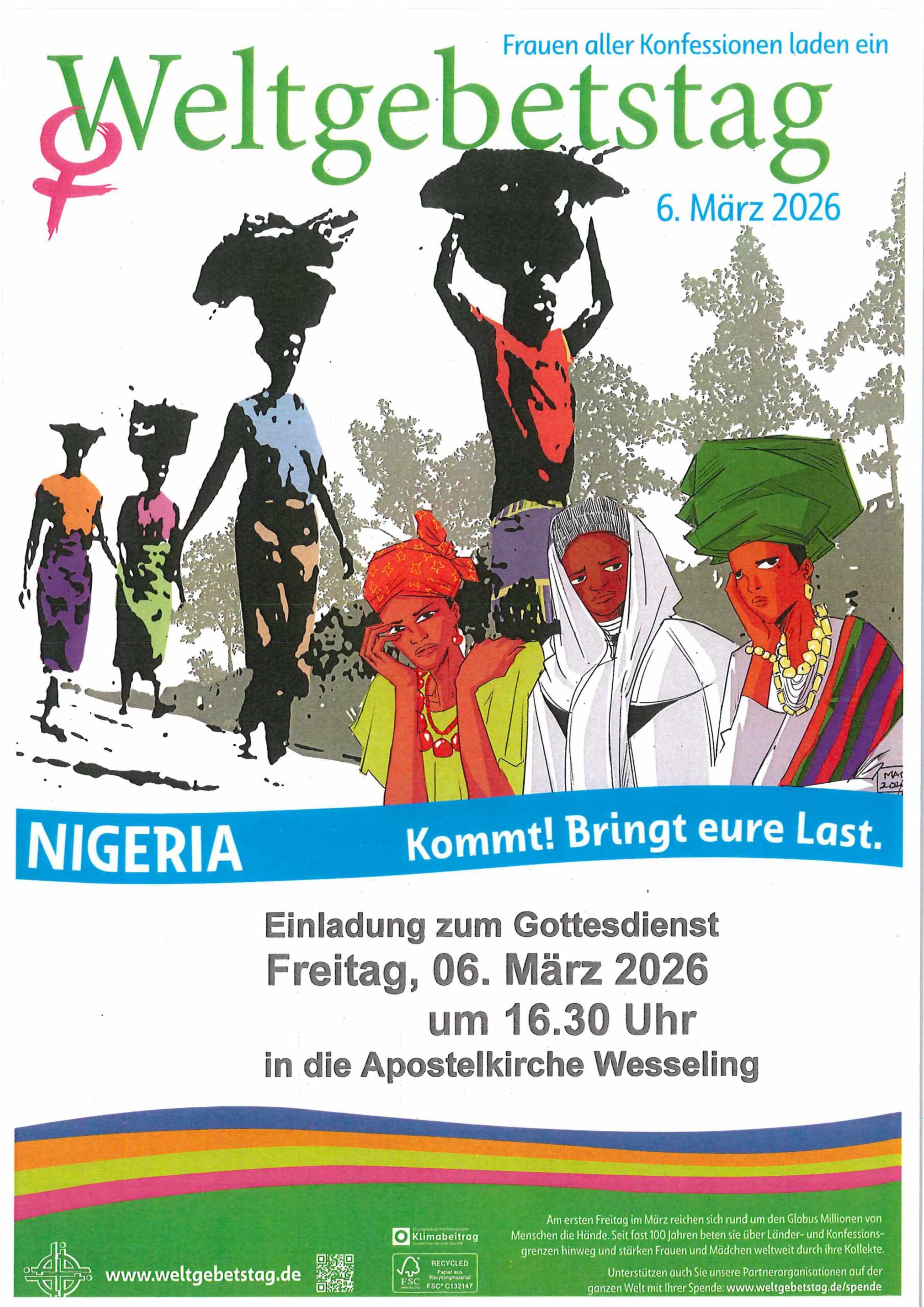 Frauen aller Konfessionen laden herzlich zum Weltgebetstag am Freitag, 6. März 2026, ein. Gemeinsam feiern wir aus diesem Anlass um 16:30 Uhr