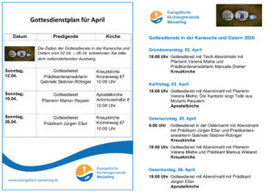Gottesdienste im April sowie die Ostergottesdienste