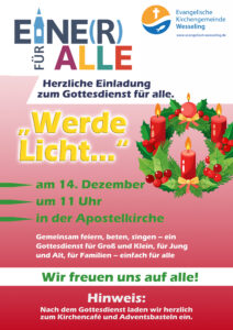 Am 3. Sonntag im Advent, dem 14. Dezember 2025, laden wir herzlich zu EINE(R) für ALLE um 11 Uhr in die Apostelkirche mit Pfarrerin Verena Miehe und Team ein. Dieses Mal steht der Gottesdient unter dem Motto „Werde Licht…“. Im Anschluss laden wir herzlich zum Kirchencafé und Adventsbasteln ein.