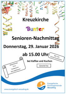 Wir laden auch dieses Jahr wieder alle Seniorinnen und Senioren herzlich am Donnerstag, dem 29. Januar 2026, ab 15 Uhr in die Kreuzkirche zu einem bunten Karnevalsnachmittag ein.