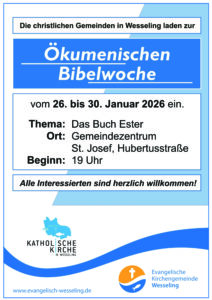 Ökumenische Bibelwoche für alle Interessierten Beitrags-Autor:glatz Beitrag veröffentlicht:16. Januar 2026 Beitrags-Kategorie:Allgemein Die Ökumenische Bibelwoche findet vom 26. bis 30. Januar 2026 statt. Die christlichen Gemeinden in Wesseling laden hierzu alle Interessierten herzlichst ein.
