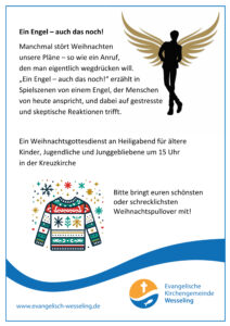 An Heiligabend laden wir herzlich zu einem unserer Weihnachtsgottesdienste um 15 Uhr in die Kreuzkirche ein. Dieser richtet sich besonders an ältere Kinder, Jugendliche und Junggebliebene. Wir freuen uns, wenn ihr mit eurem schönsten oder auch schrecklichsten Weihnachtspullover kommt.