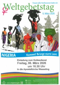 Weltgebetstag – Gottesdienst in der Apostelkirche Beitrags-Autor:glatz Beitrag veröffentlicht:11. Februar 2026 Beitrags-Kategorie:Allgemein Frauen aller Konfessionen laden herzlich zum Weltgebetstag am Freitag, 6. März 2026, ein. Gemeinsam feiern wir aus diesem Anlass um 16:30 Uhr den Gottesdienst in der Apostelkirche.